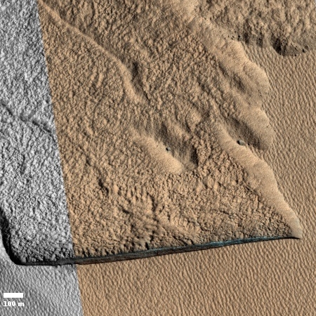 Curiosity purposely ran over a megaripple (fine grained sandy ripple with a coarser pebble coating), Calef notes, to create a “scuff” which churned up and bisected the feature to observe any layering or material within.