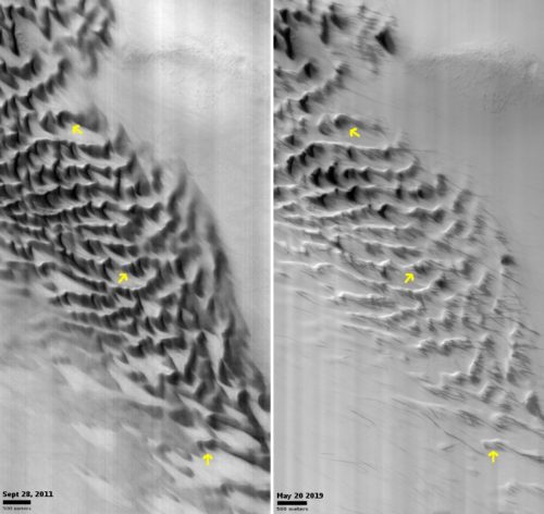 Changes in the sand dunes in the Hellas Basin region on Mars in 8 years. Images credit: MRO/HiRISE, NASA JPL/Univ. Arizona. Cropped and annotated by Bob Zimmerman