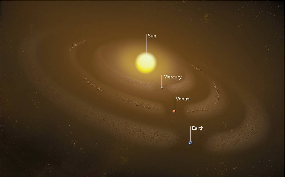 An illustration of the dust rings near the inner planets, circling the Sun. Image Credit: NASA’s Goddard Space Flight Center/Mary Pat Hrybyk-Keith [Via Universe Today]