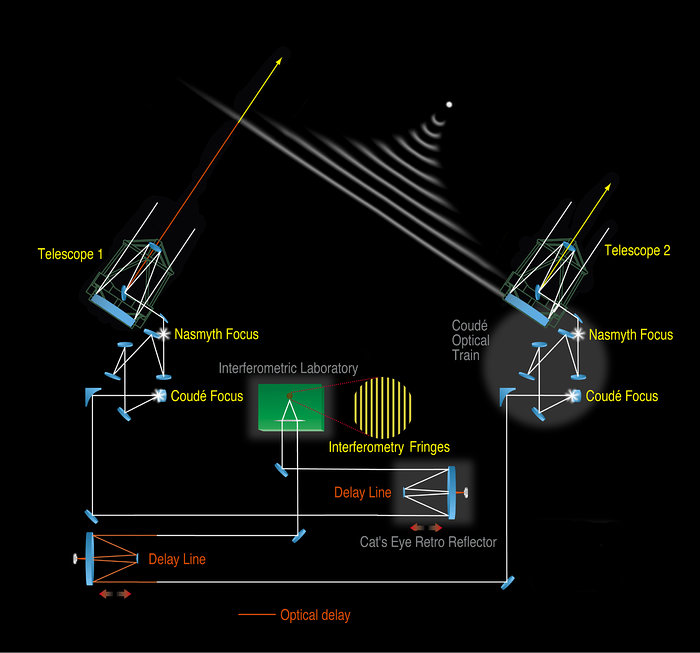 [2] Interferometry is a technique that allows astronomers to create a super-telescope by combining several smaller telescopes. ESO’s VLTI is an interferometric telescope created by combining two or more of the Unit Telescopes (UTs) of the Very Large Telescope or all four of the smaller Auxiliary Telescopes. While each UT has an impressive 8.2-m primary mirror, combining them creates a telescope with 25 times more resolving power than a single UT observing in isolation.