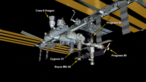 “Dec. 16, 2024: International Space Station Configuration. Five spaceships are parked at the space station including the SpaceX Dragon Freedom, the Northrop Grumman Cygnus resupply ship, the Soyuz MS-26 crew ship, and the Progress 89 and 90 resupply ships.” Credits: NASA