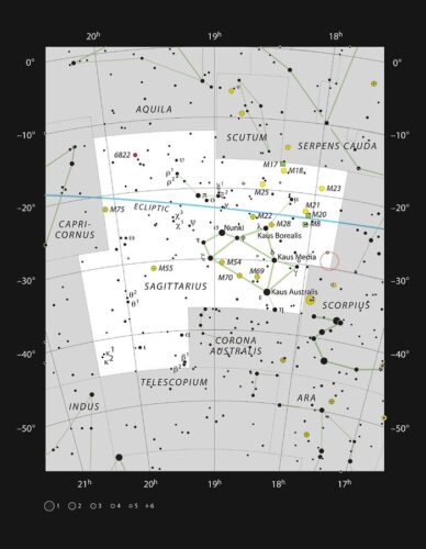 This chart shows the location of the field of view within which Sagittarius A* resides — the black hole is marked with a red circle within the constellation of Sagittarius (The Archer). This map shows most of the stars visible to the unaided eye under good conditions.