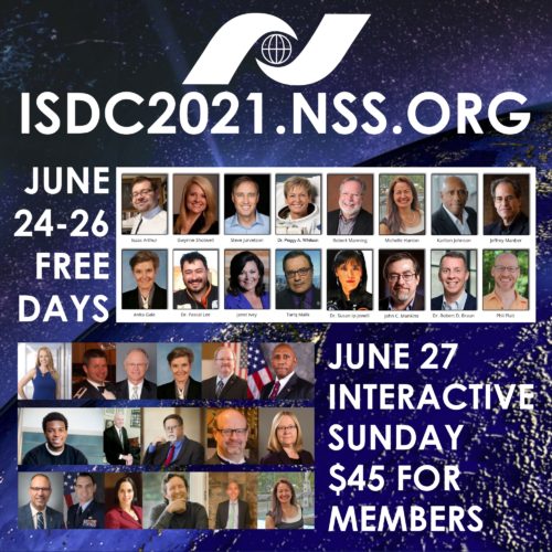 The National Space Society‘s annual meeting – International Space Development Conference (ISDC 2021)– starts today, June 24th as a virtual on-line event. The presentations on the first 3 days are available at no charge. An Interactive ISDC Sunday ($45) will bring “participants into contact with leading space experts in an interactive format. These discussions [will be] challenging and stimulating.”