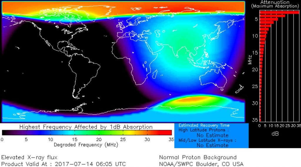 Shortwave radio blackouts were subsequently observed over the Pacific Ocean and especially around the Arctic Circle. This map from NOAA shows the affected geographic regions.