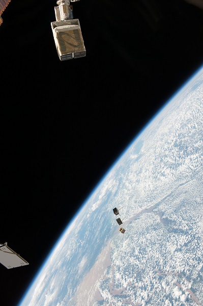 The image below shows two Dove earth observations satellites from the company Planet Labs shooting past the ISS solar panels during their deployment into orbit this week: CubeSats Deployed From the International Space Station – NASA