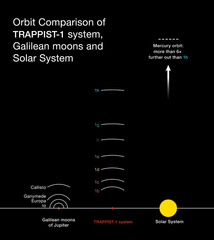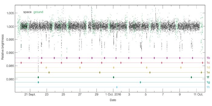 Astronomers using the TRAPPIST–South telescope at ESO’s La Silla Observatory, the Very Large Telescope (VLT) at Paranal and the NASA Spitzer Space Telescope, as well as other telescopes around the world [1], have now confirmed the existence of at least seven small planets orbiting the cool red dwarf star TRAPPIST-1 [2]. All the planets, labelled TRAPPIST-1b, c, d, e, f, g and h in order of increasing distance from their parent star, have sizes similar to Earth [3].