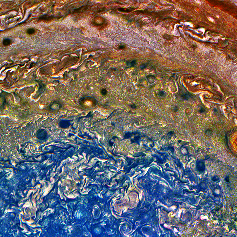 This image captures the intensity of the jets and vortices in Jupiter’s North North Temperate Belt.