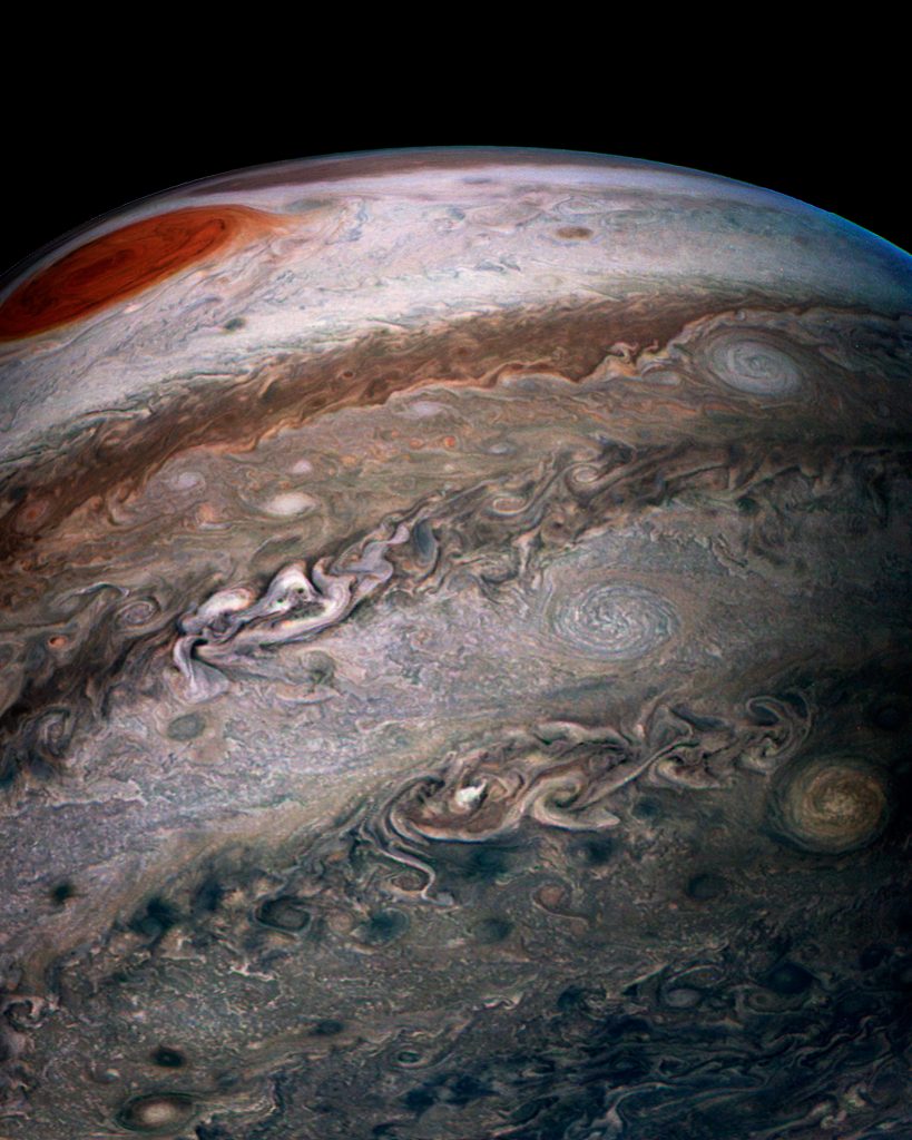A bright oval at bottom center stands out in the scene. This feature appears uniformly white in ground-based telescope observations. However, with JunoCam we can observe the fine-scale structure within this weather system, including additional structures within it. There is not significant motion apparent in the interior of this feature; like the Great Red Spot, its winds probably slows down greatly toward the center.