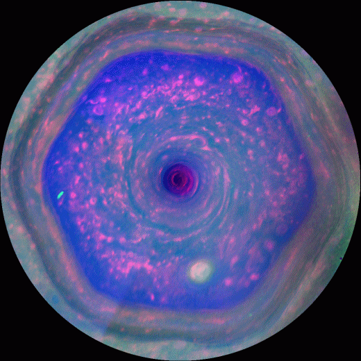The movie comprises one hour of observations as the spacecraft moved southward over Saturn. It begins with a view of the swirling vortex at the planet’s north pole, then heads past the outer boundary of the hexagon-shaped jet stream and beyond.