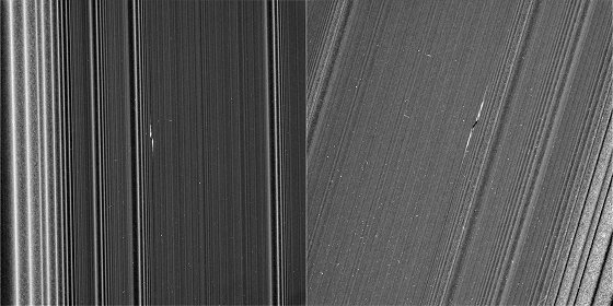 This observation was Cassini’s first targeted flyby of a propeller. The views show the object from vantage points on opposite sides of the rings. The top image looks toward the rings’ sunlit side, while the bottom image shows the unilluminated side, where sunlight filters through the backlit ring.