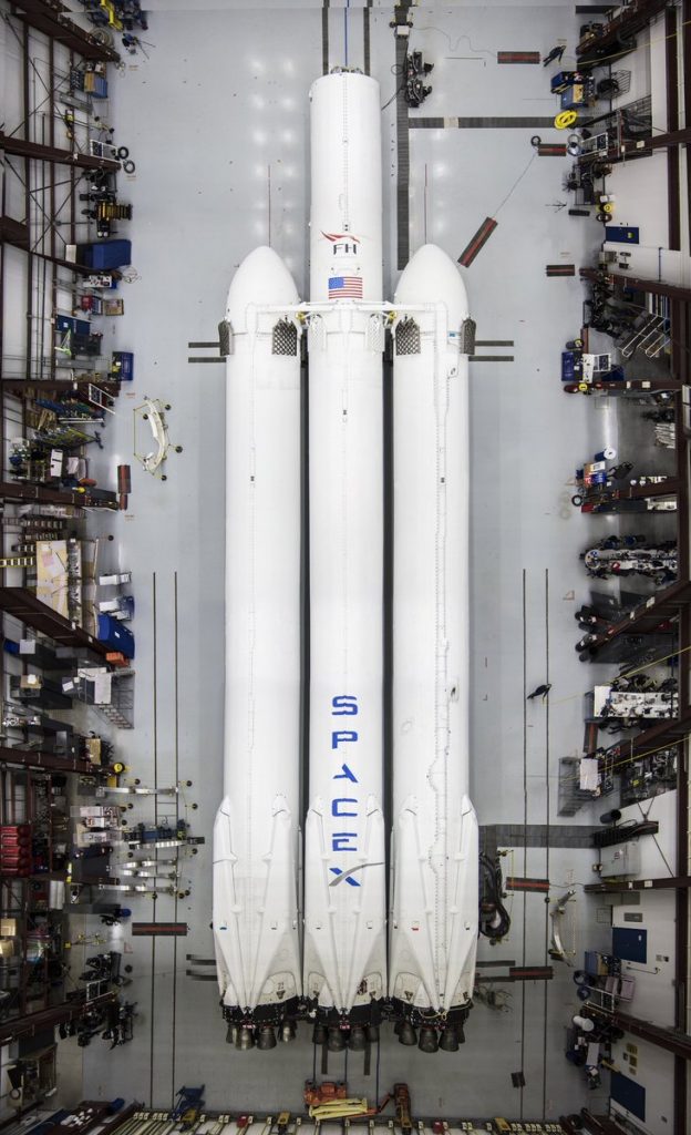 ** Elon Musk on Twitter posted photos of the first Falcon Heavy launcher in preparation in the hangar for a launch from Kennedy Space Center in January :