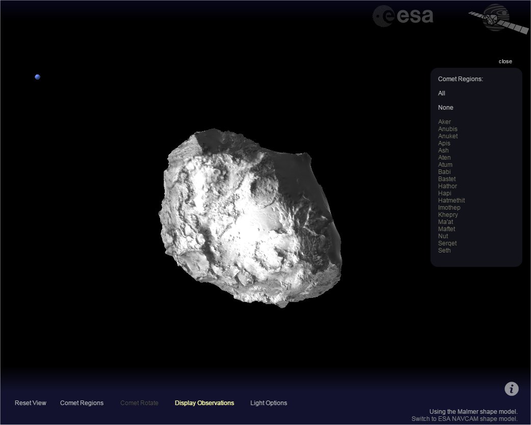 Check out this cool Rosetta Comet Viewer Tool at ESA, which was originally developed by Swedish space enthusiast and image processing expert Mattias Malmer. He took images of Comet 67P/C-G from the Rosetta probe and combined them in a way that lets the user rotate, zoom-in and out from, and highlight particular areas on the comet.