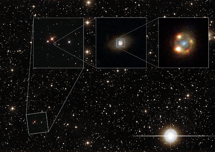 This composite image shows the gravitationally lensed type Ia supernova iPTF16geu, as seen with different telescopes. The background image shows a wide-field view of the night sky as seen with the Palomar Observatory located on Palomar Mountain, California. The leftmost image shows observations made with the Sloan Digital Sky Survey (SDSS). The central image was taken by the NASA/ESA Hubble Space Telescope and shows the lensing galaxy SDSS J210415.89-062024.7. The rightmost image was also taken with Hubble and depicts the four lensed images of the supernova explosion, surrounding the lensing galaxy. [Larger images]An international team, led by astronomers from the Stockholm University, Sweden, has discovered a distant type Ia supernova, called iPTF16geu [1] — it took the light 4.3 billion years to travel to Earth [2]. The light from this particular supernova was bent and magnified by the effect of gravitational lensing so that it was split into four separate images on the sky [3]. The four images lie on a circle with a radius of only about 3000 light-years around the lensing foreground galaxy, making it one of the smallest extragalactic gravitational lenses discovered so far. Its appearance resembles the famous Refsdal supernova, which astronomers detected in 2015 (heic1525). Refsdal, however, was a core-collapse supernova.