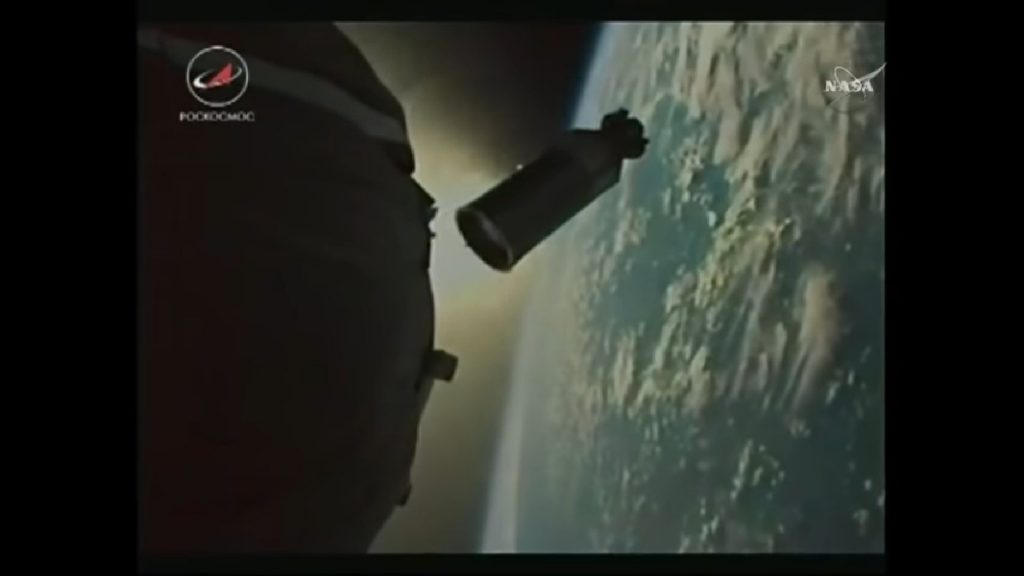This launch had a rocketcam that sent views from the Soyuz all the way to orbit. Here is a screen capture of the upper stage falling away from the capsule: