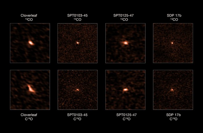 This image shows the four distant starburst galaxies observed by ALMA. The top images depict the 13CO emission from each galaxy, while the bottom ones show their C18O emission. The ratio of these two isotopologues allowed astronomers to determine that these starburst galaxies have an excess of massive stars. [ Larger images ]Schneider explained,