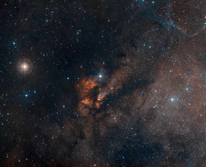 The central area of RCW 38 is visible here as a bright, blue-tinted region, an area inhabited by numerous very young stars and protostars that are still in the process of forming. The intense radiation pouring out from these newly born stars causes the surrounding gas to glow brightly. This is in stark contrast to the streams of cooler cosmic dust winding through the region, which glow gently in dark shades of red and orange. The contrast creates this spectacular scene — a piece of celestial artwork.