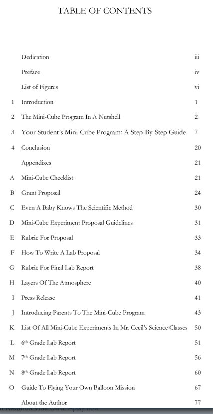 A book written for secondary public and private school STEM instructors, home schooling, and undergraduate STEM courses of study explaining how to set up their own student focused “space program” utilizing the Mini-Cube Program. With this Informal STEM Project Based Learning Activity, students can have the unique, affordable, and challenging opportunity to send experiments via high altitude balloon to an altitude of 100,000 feet (20 miles or 32 km), commonly known as the “edge of space.” Utilizing the scientific method, team work, research, and communicating in writing the results and applications for peer review, students will participate in the full cycle of an actual experiment from the original question to the published results and conduct true science at the edge of space.