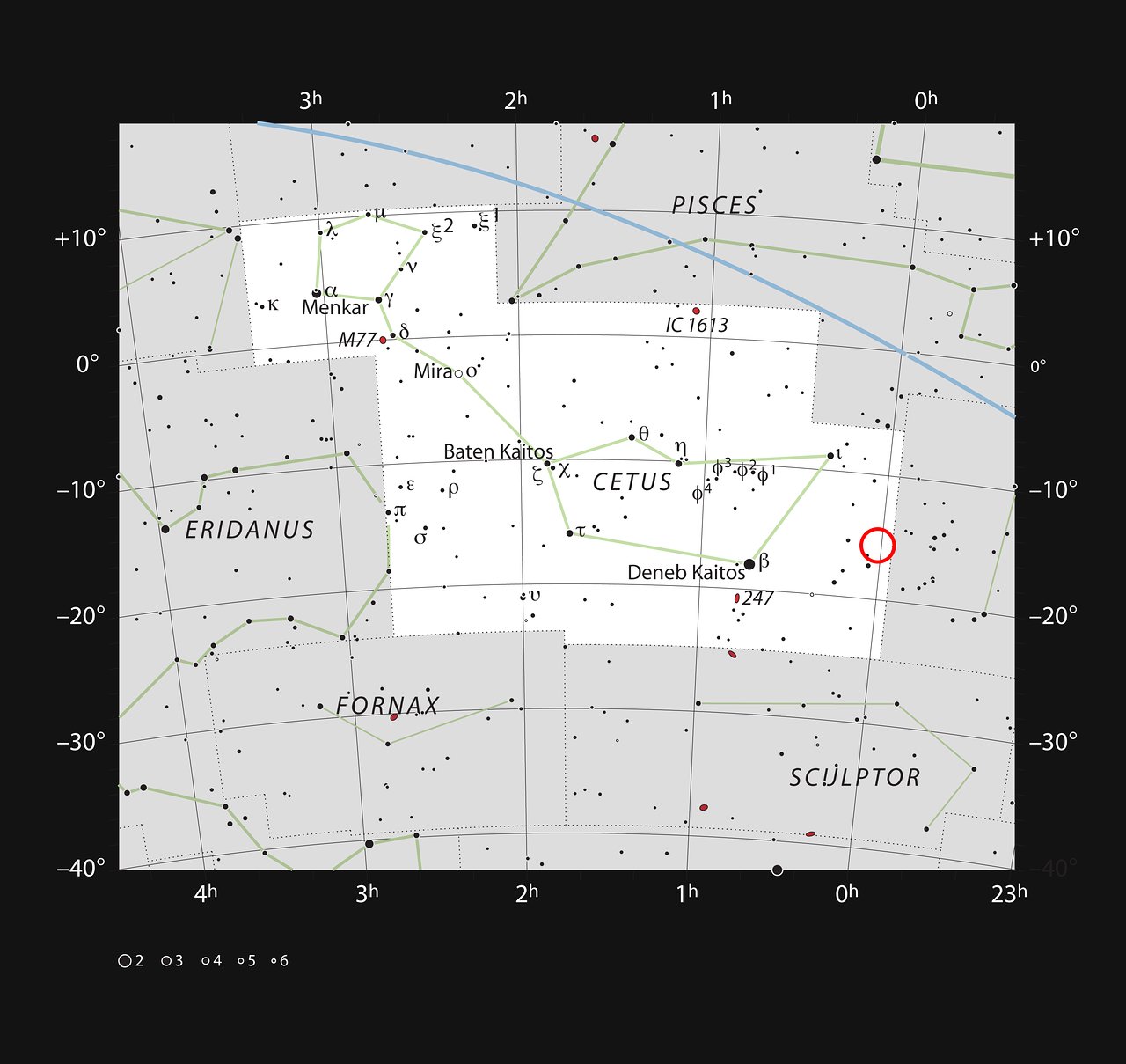 WLM was discovered in 1909 by German astronomer Max Wolf, and identified as a galaxy some fifteen years later by astronomers Knut Lundmark and Philibert Jacques Melotte — explaining the galaxy’s unusual moniker. The dim galaxy is located in the constellation of Cetus (The Sea Monster) about three million light-years away from the Milky Way, which is one of the three dominant spiral galaxies in the Local Group.