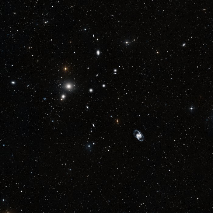 Towards the bottom right of this image is the large barred spiral galaxy NGC 1365. This is a striking example of its type, the prominent bar passing through the central core of the galaxy, and the spiral arms emerging from the ends of the bar. In keeping with the nature of cluster galaxies, there is more to NGC 1365 than meets the eye. It is classified as a Seyfert Galaxy, with a bright active galactic nucleus also containing a supermassive black hole at its centre.