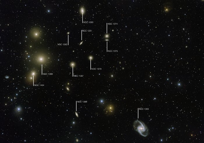 At the centre of this particular cluster, in the middle of the three bright fuzzy blobs on the left side of the image, is what is known as a cD galaxy — a galactic cannibal. cD galaxies like this one, called NGC 1399, look similar to elliptical galaxies but are bigger and have extended, faint envelopes [1]. This is because they have grown by swallowing smaller galaxies drawn by gravity towards the centre of the cluster [2].