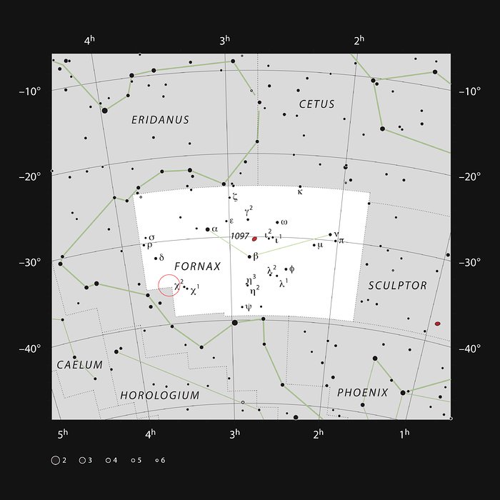 [2] The central galaxy is often the brightest galaxy in a cluster, but in this case the brightest galaxy, NGC 1316, is situated at the edge of the cluster, just outside the area covered by this image. Also known as Fornax A, it is one of the most powerful sources of radio waves in the sky. The radio waves, which can be seen by specialised telescopes sensitive to this kind of radiation, emanate from two enormous lobes extending far into space either side of the visible galaxy. The energy that powers the radio emission comes from a supermassive black hole lurking at the centre of the galaxy which is emitting two opposing jets of high-energy particles. These jets produce the radio waves when they plough into the rarefied gas which occupies the space between galaxies in the cluster.