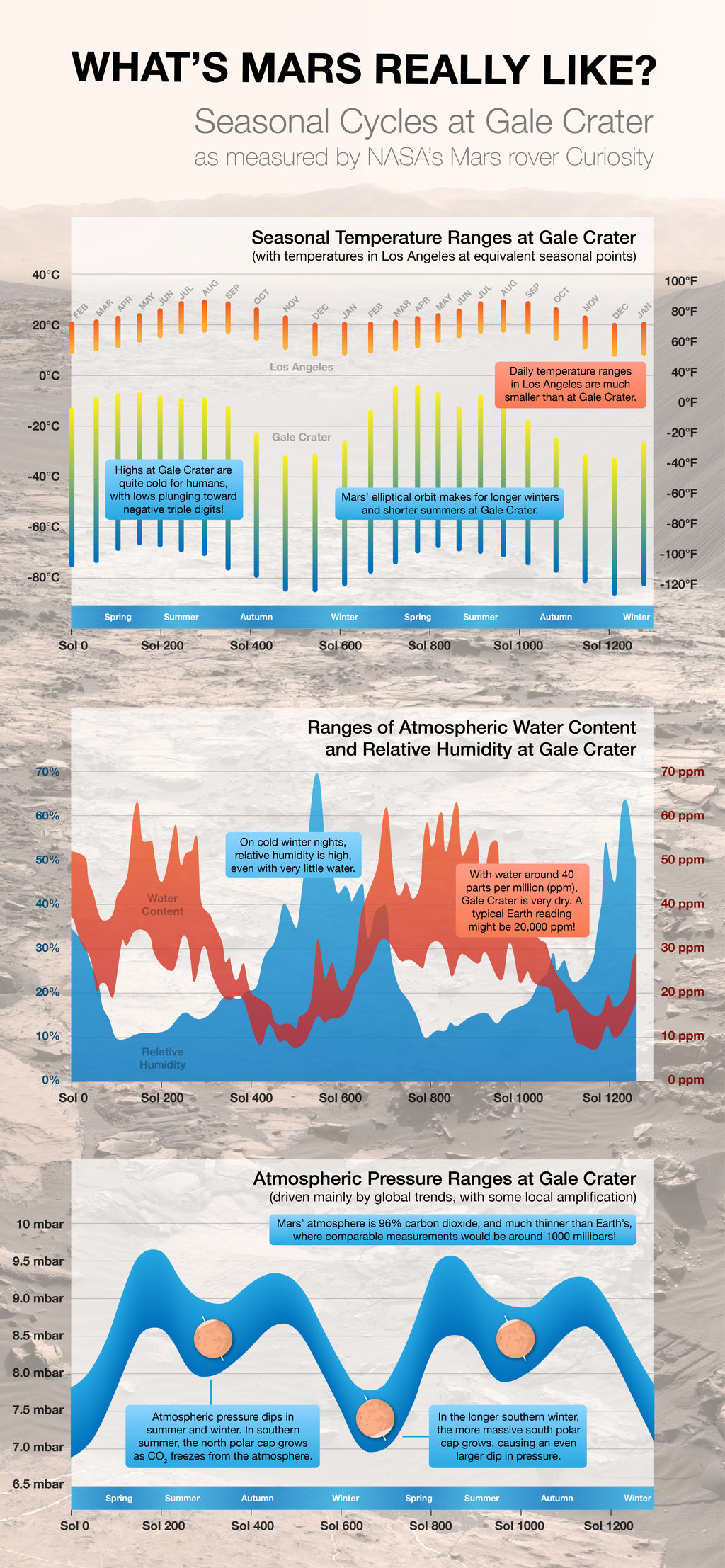 Here is a infographic on Mars seasons: Seasonal Cycles in Curiosity’s First Two Martian Years – Mars Science Laboratory –