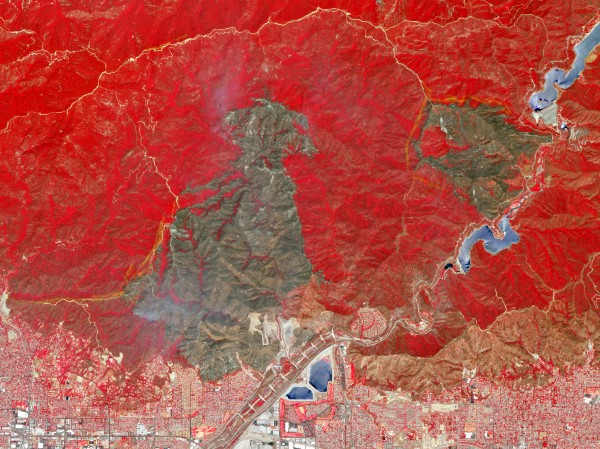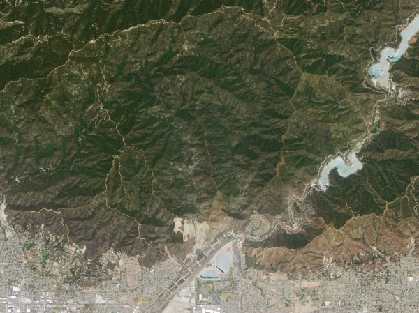 On the [top] is a true-color image, showing the area On June 4, 2016, more or less as it would appear to a human observer. The dark green, chaparral-covered hillsides contrast with gray rooftops and roadways — the northern fringes of the Los Angeles conurbation.