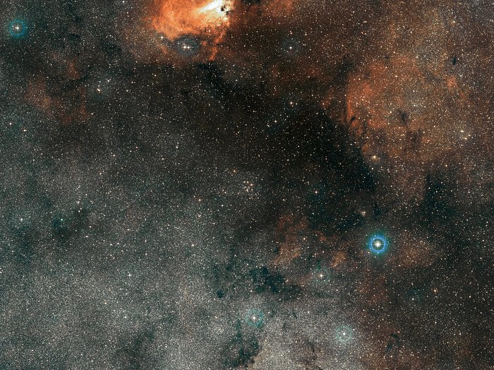 The small smattering of bright blue stars in the upper left of this vast new 615 megapixel ESO image is the perfect cosmic laboratory in which to study the life and death of stars. Known as Messier 18 this star cluster contains stars that formed together from the same massive cloud of gas and dust. This image, which also features red clouds of glowing hydrogen and dark filaments of dust, was captured by the VLT Survey Telescope (VST) located at ESO’s Paranal Observatory in Chile.