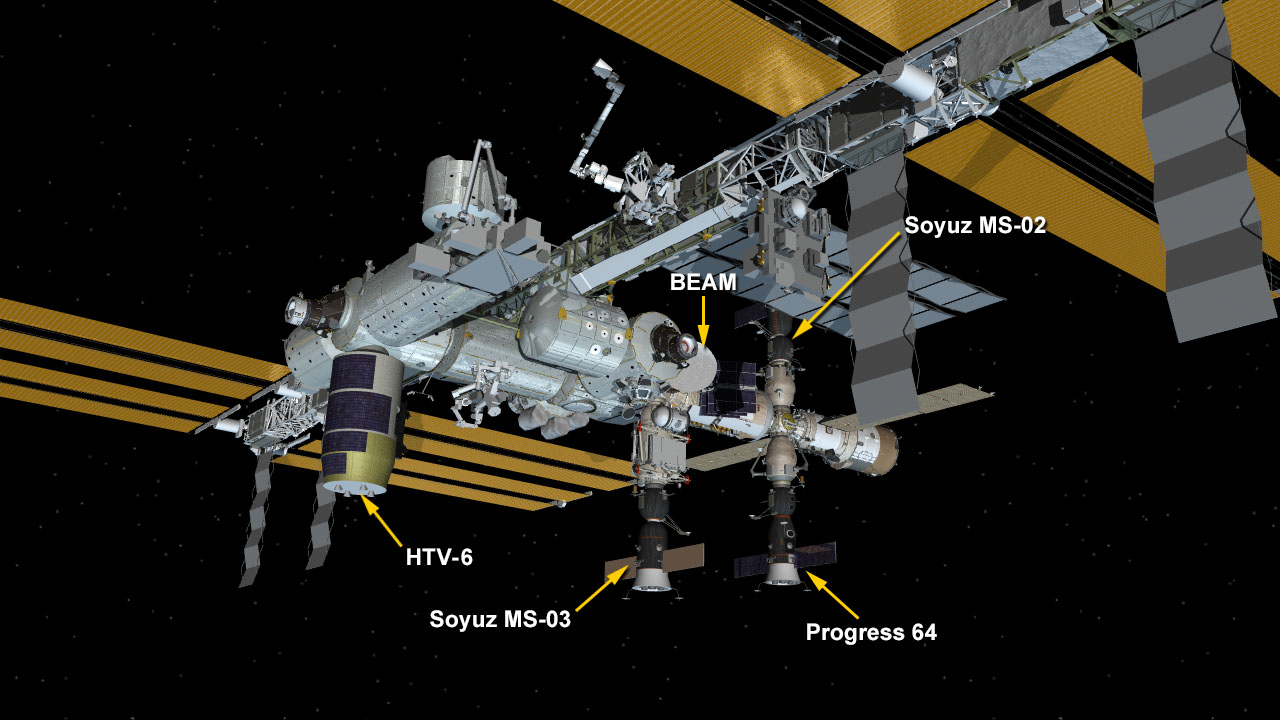 A Japanese cargo ship, named Kounotori 6 H-II Transfer Vehicle or HTV-6, berthed to the International Space Station today: Japan’s “White Stork” Spacecraft Installed on Station | Space Station/NASA .