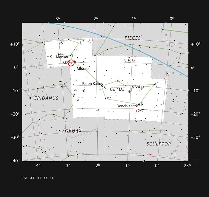 This picturesque spiral galaxy appears to be tranquil, but there is more to it than meets the eye. Messier 77 (also known as NGC 1068) is one of the closest active galaxies, which are some of the most energetic and spectacular objects in the Universe. Their nuclei are often bright enough to outshine the whole of the rest of the galaxy. Active galaxies are among the brightest objects in the Universe and emit light at most, if not all, wavelengths, from gamma rays and X-rays all the way to microwaves and radiowaves. Messier 77 is further classified as a Type II Seyfert galaxy, characterised by being particularly bright at infrared wavelengths.