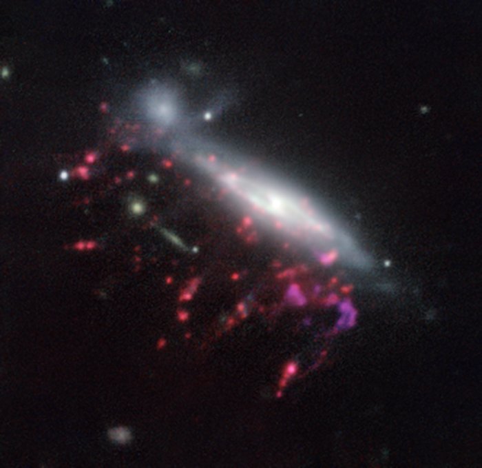 An Italian-led team of astronomers used the MUSE (Multi-Unit Spectroscopic Explorer) instrument on the Very Large Telescope (VLT) at ESO’s Paranal Observatory in Chile to study how gas can be stripped from galaxies. They focused on extreme examples of jellyfish galaxies in nearby galaxy clusters, named after the remarkable long “tentacles” of material that extend for tens of thousands of light-years beyond their galactic discs [1][2].