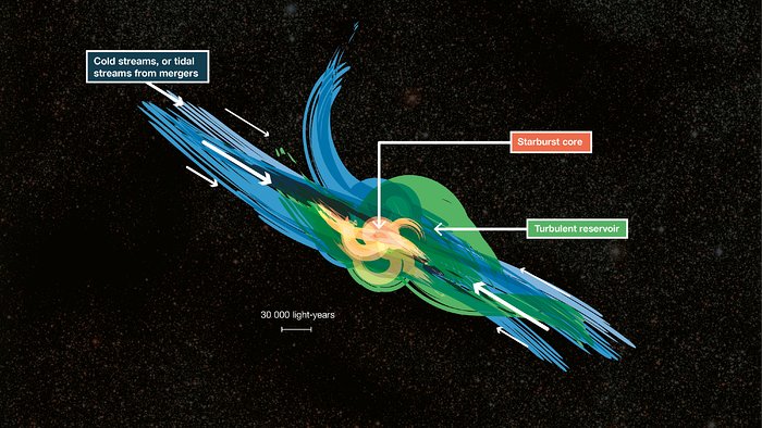“This discovery represents a major step forward in our understanding of how the inflow of material is regulated around the most intense starburst galaxies in the early Universe,” says ESO’s Director for Science, Rob Ivison, a co-author on the paper. “It shows what can be achieved when scientists from a variety of disciplines come together to exploit the capabilities of the world’s most powerful telescope.”