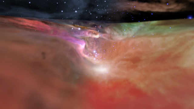 The three-dimensional video provides a look at the fantastic topography of the nebula. A torrent of ultraviolet radiation and stellar winds from the massive, central stars of the Trapezium star cluster have carved out a cavernous bowl-like cavity in the wall of a giant cloud of cold molecular hydrogen laced with dust.