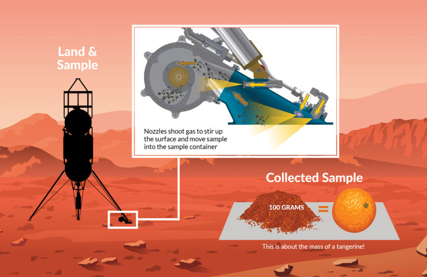 The goal is to design, build, and demonstrate a low cost system for gathering a sample of material from the surface of a planet or moon. They plan to attach a prototype version to a Masten vertical-takeoff and landing rocket vehicle and do a demo mission in California.