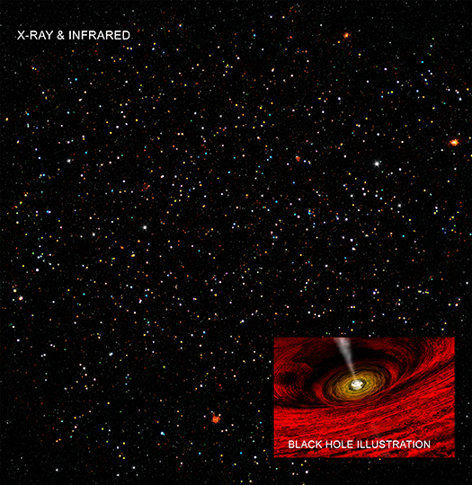 This image shows data from a massive observing campaign that includes NASA’s Chandra X-ray Observatory. These Chandra data have provided strong evidence for the existence of so-called intermediate-mass black holes (IMBHs). Combined with a separate study also using Chandra data, these results may allow astronomers to better understand how the very largest black holes in the early Universe formed, as described in our latest press release. Credit: X-ray: NASA/CXC/ICE/M.Mezcua et al.; Infrared: NASA/JPL-Caltech; Illustration: NASA/CXC/A.Hobart