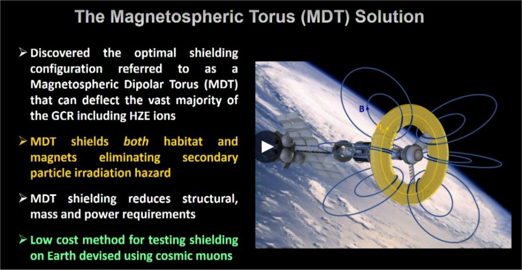 There have been various designs proposed over the years for magnetic shields. During the recent NIAC Symposium (see earlier posting), plasma physicist John Slough described what looks to be a viable design that he calls the Magnetospheric Torus (MDT). It appears to be doable with current technology, e.g. high-temperature superconducting magnets are now commonplace, and is quite effective, even for the highest energy GCR.