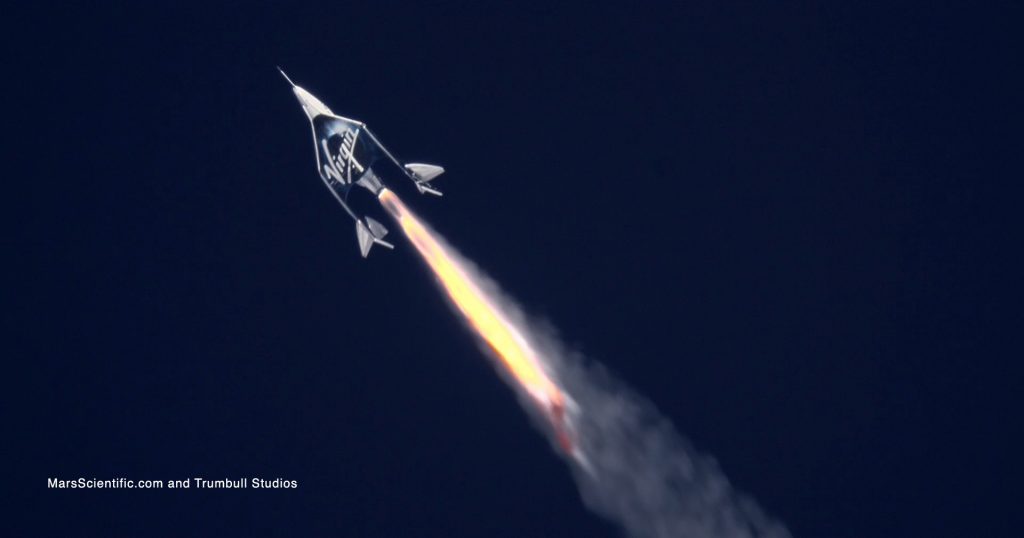 In its fifth supersonic rocket powered test flight, Virgin Galactic reached space for the second time today in the skies above Mojave CA. Spaceship VSS Unity reached its highest speed and altitude to date and, for the first time, carried a third crew member on board along with research payloads from the NASA Flight Opportunities program.