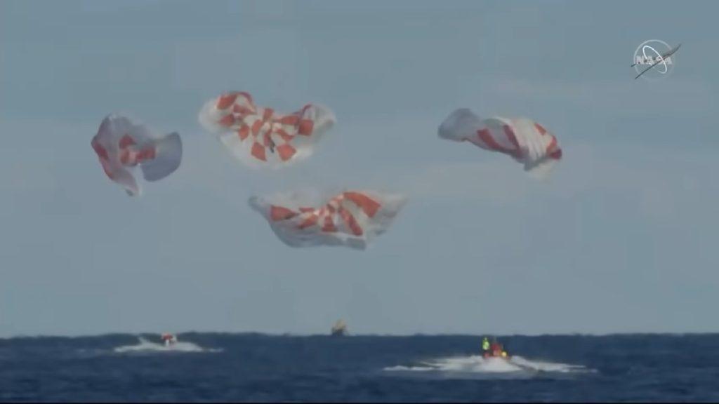 A view of the Crew Dragon as it descended to the Atlantic ocean under four giant parachutes: