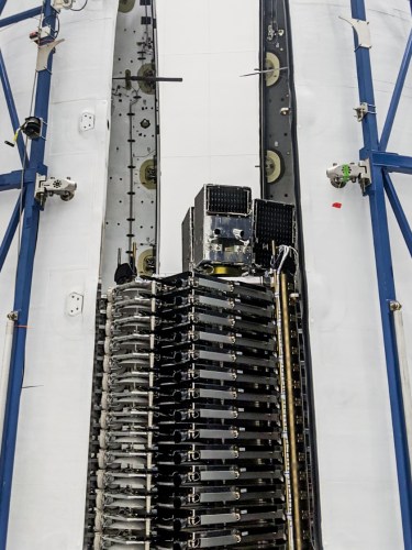 A view of the Starlink and SkySat satellites before being enclosed in the nosecone fairings: