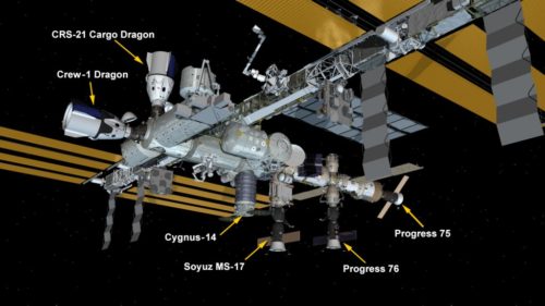 The ISS currently has two SpaceX vehicles docked to it. The Northrop-Grumman Cygnus-14 is the other commercial cargo vehicle. There are also three Russian vehicles including a Soyuz crew capsule and two Progress cargo vessels.