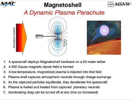 NextBigFuture points to a neat concept for slowing a spacecraft when it enters an atmosphere. A study of the Magnetoshell concept was funded by the NASA Innovative Advanced Concepts (NIAC). As shown in the slide below, the spacecraft would release a tethered device that creates a magnetized plasma, which in turn interacts with the atoms in the atmosphere in a manner that creates drag. The size and mass of such a system is much less than for a reentry shield and big parachutes. So it would allow for greater payload mass for missions to Mars or other bodies in the solar system with atmospheres.