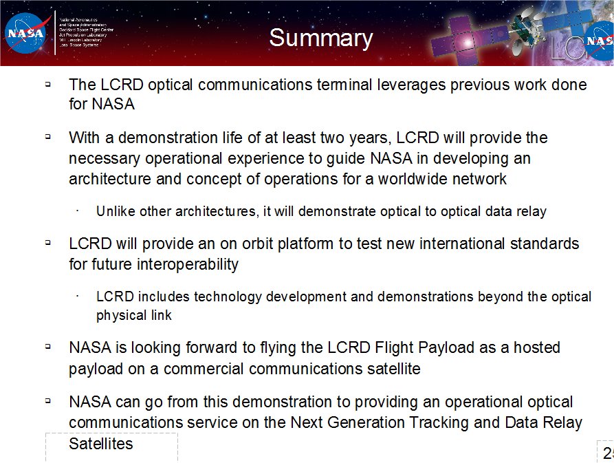 Here are some slides from the presentation about the successful demonstration of high bandwidth communications via laser between the LADEE orbiter at the Moon and stations on earth: