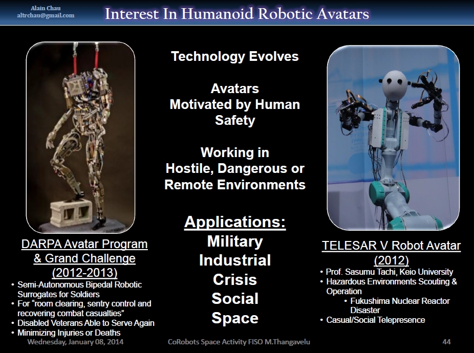 Thangavelu’s presentation discusses many topics related to such scenarios. He starts with the CoRobot concept, in which robots work closely with people to assist them in different ways. He then moves to the SARA (Surrogate Astronaut Robot Avatar) concept in which a person wears an elaborate suit whose movements are mimicked by a robot out, say, on the surface of the Moon. Thangavelu lays out a plan for developing and testing SARA systems starting with a facility on the ISS.