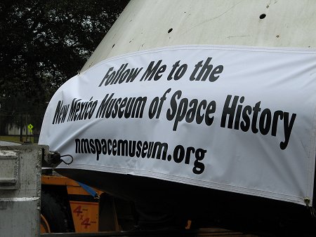 PHOTO CUTLINE: Apollo Boilerplate 1 – Behind this banner is an Apollo Boilerplate Command Module on its way to the New Mexico Museum of Space History from its previous home at the Discovery Center in Ocala, Florida. The boilerplate, which is the first of many exhibits and artifacts expected through the museum’s new affiliation with the Smithsonian, left Florida on Tuesday, February 26, and is expected to arrive at the museum in Alamogordo at noon on Friday, March 1, weather permitting. The public is invited to welcome the module to its new home.