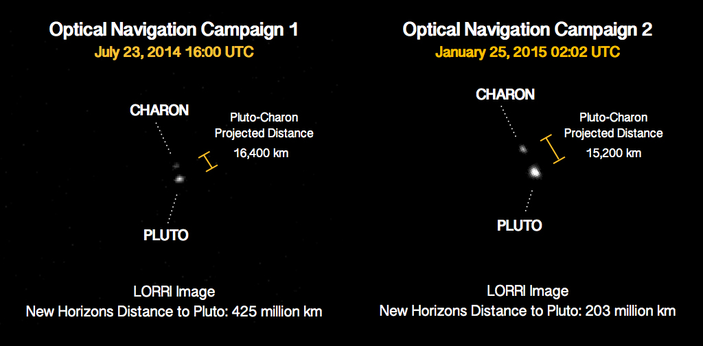 The new images, taken with New Horizons’ telescopic Long-Range Reconnaissance Imager (LORRI) on Jan. 25 and Jan. 27, were the first acquired during the spacecraft’s 2015 approach to the Pluto system, which culminates with a close flyby of Pluto and its system of moons on July 14. New Horizons was more than 126 million miles (203 million kilometers) away from Pluto when it began taking the photos, which show Pluto and largest moon, Charon.