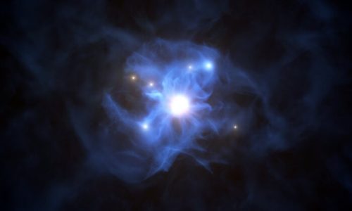 With the help of ESO’s Very Large Telescope (VLT), astronomers have found six galaxies lying around a supermassive black hole, the first time such a close grouping has been seen within the first billion years of the Universe. This artist’s impression shows the central black hole and the galaxies trapped in its gas web. The black hole, which together with the disc around it is known as quasar SDSS J103027.09+052455.0, shines brightly as it engulfs matter around it. Credits ESO.