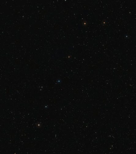 This image shows the sky around SDSS J103027.09+052455.0, a quasar powered by a supermassive black hole surrounded by at least six galaxies. This picture was created from images in the Digitized Sky Survey 2. Credits ESO