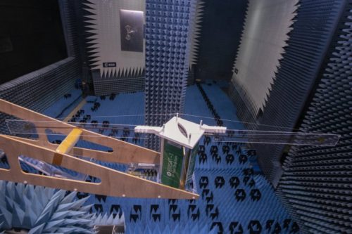 “Ireland’s first space mission, EIRSAT-1, seen taking place at ESA’s Hertz antenna test chamber”. Credits: ESA