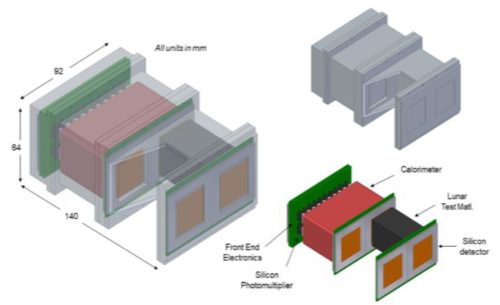 “Instrument overview with major elements and dimensions labeled. Two sides of the instrument readout eparately for control and shielded background comparison.” Credits: J.Fuchs & M. Halvorson UAH