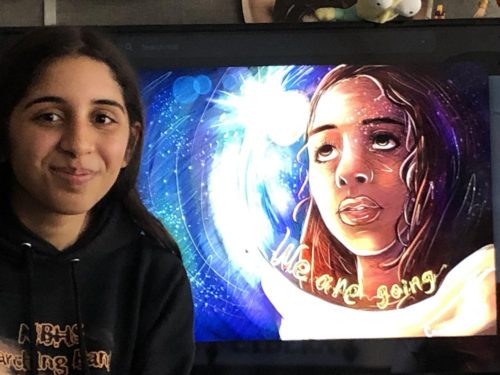 Camila’s winning entry is a woman astronaut gazing out into space and the Moon with the words “We Are Going” at the bottom of her helmet.